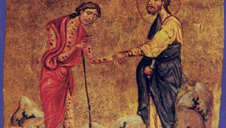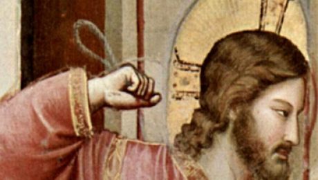 (J 2,13-25) Zbliżała się pora Paschy żydowskiej i Jezus udał się do Jerozolimy. W świątyni napotkał tych, którzy sprzedawali woły, baranki i gołębie oraz siedzących za stołami bankierów. Wówczas sporządziwszy sobie bicz ze sznurków, powyrzucał wszystkich ze świątyni, także baranki i woły, porozrzucał monety bankierów, a stoły powywracał. Do tych zaś, którzy sprzedawali gołębie, rzekł: